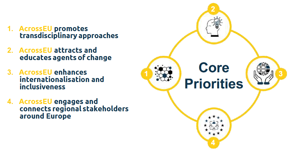 Directly answering the global and regional challenges faced by our universities, which led to the definition of our mission, these priorities are the practical targets that permeate every layer of our operation. Projects, initiatives and daily AcrossEU activities are cross-checked against these core priorities, ensuring that they not only align with but actively drive our mission forward.