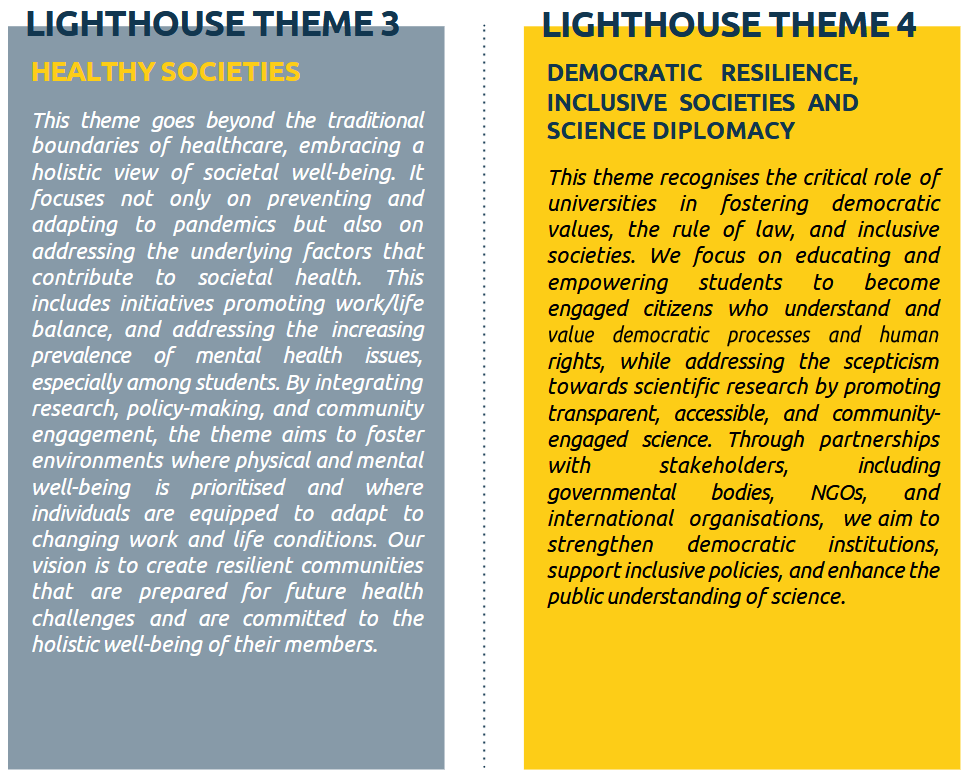 ¹Our “Healthy Society” Lighthouse Theme is derived from our internal research analysis, which examined the quantity and impact of AcrossEU members’ publications from 2013 to 2022. This mapping exercise revealed that the alliance performs better than the European average in several scientific areas, particularly in medicine, psychology and biology. These results are evidenced by notable standings obtained by some of our members in medical sciences categories of the 2023 edition of the ARWU ranking “by subject”. Additionally, when categorising AcrossEU’s publications based on their relevance to the Sustainable Development Goals (SDGs), using a vocabulary classifier, we observed impressive results for SDG 3 – Good Health and Well-being, with contributions to this SDG exceeding the European average by 50% on the same period.
